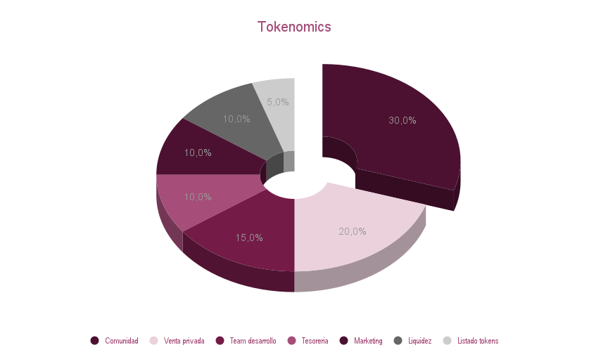 <table data-header-hidden><thead><tr><th width="251"></th><th width="148"></th><th></th></tr></thead><tbody><tr><td><strong>Categoría</strong></td><td><strong>Porcentaje</strong></td><td><strong>Descripción</strong></td></tr><tr><td><strong>Comunidad</strong></td><td>30%</td><td>Recompensas, incentivos y participación en la gobernanza.</td></tr><tr><td><strong>Ventas Privadas</strong></td><td>20%</td><td>Fondos destinados a garantizar el desarrollo del ecosistema y la expansión del proyecto.</td></tr><tr><td><strong>Equipo y Desarrollo</strong></td><td>15%</td><td>Fondo para el crecimiento y sostenibilidad del equipo. Sujeto a un período de vesting.</td></tr><tr><td><strong>Tesorería</strong></td><td>10%</td><td>Reservas estratégicas para garantizar la estabilidad del token.</td></tr><tr><td><strong>Marketing y Alianzas</strong></td><td>10%</td><td>Campañas de adopción, colaboraciones y desarrollo de marca.</td></tr><tr><td><strong>Liquidez</strong></td><td>10%</td><td>Fondos para asegurar la estabilidad del token en los mercados.</td></tr><tr><td><strong>Listado de Tokens</strong></td><td>5%</td><td>Financiamiento para listar tokens con comunidades activas dentro de la plataforma.</td></tr></tbody></table>
